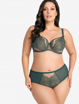 Sujetador sin relleno con aro, tul transparente y encaje color verde.
