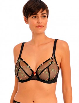 Sujetador sin relleno rose blossom de freya, color negro con rosas bordadas.