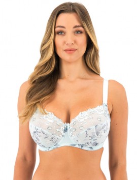 Sujetador Carolina de Fantasie en color menta con estampado floral, bordado floral sobre tul transparente en la parte superior de las copas.
