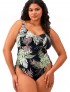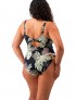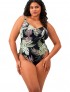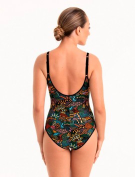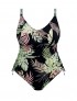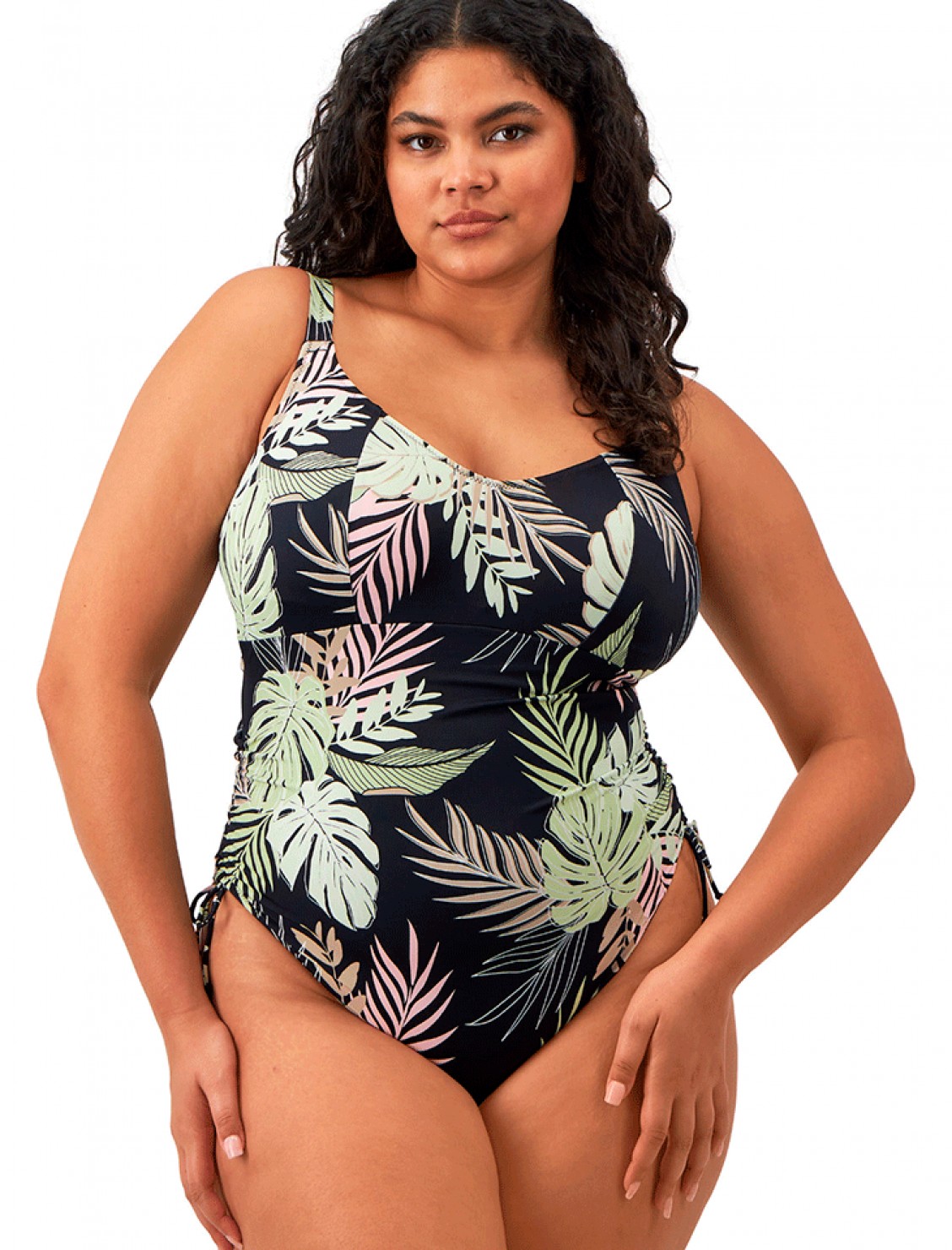 Bañador Tropical Retreat de Elomi en fondo negro con estampado floral en verde y rosa empolvado, sin aro y sujeción en la espalda. Cordón ajustable en ambos laterales.