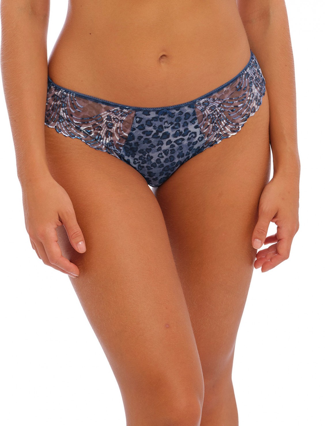 Braga antonia de fantasie, estampado animal print en tonos azules, con encaje en los laterales.