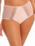 Preciosa braga de corte alto estilo vintage, confeccionada en tul semitransparente, con un panel frontal de tul, combinado con un forro de algodón que le da un toque de opacidad, para una máxima comodidad y discreción, enmarcado con unos paneles de tul bordado con un motivo de pequeños diamantes y un bonito contraste de brillos y mates . Los laterales y la parte trasera son de tul semitransparente con una costura central que respeta la forma redondeada de las nalgas, sin aplastarlas.