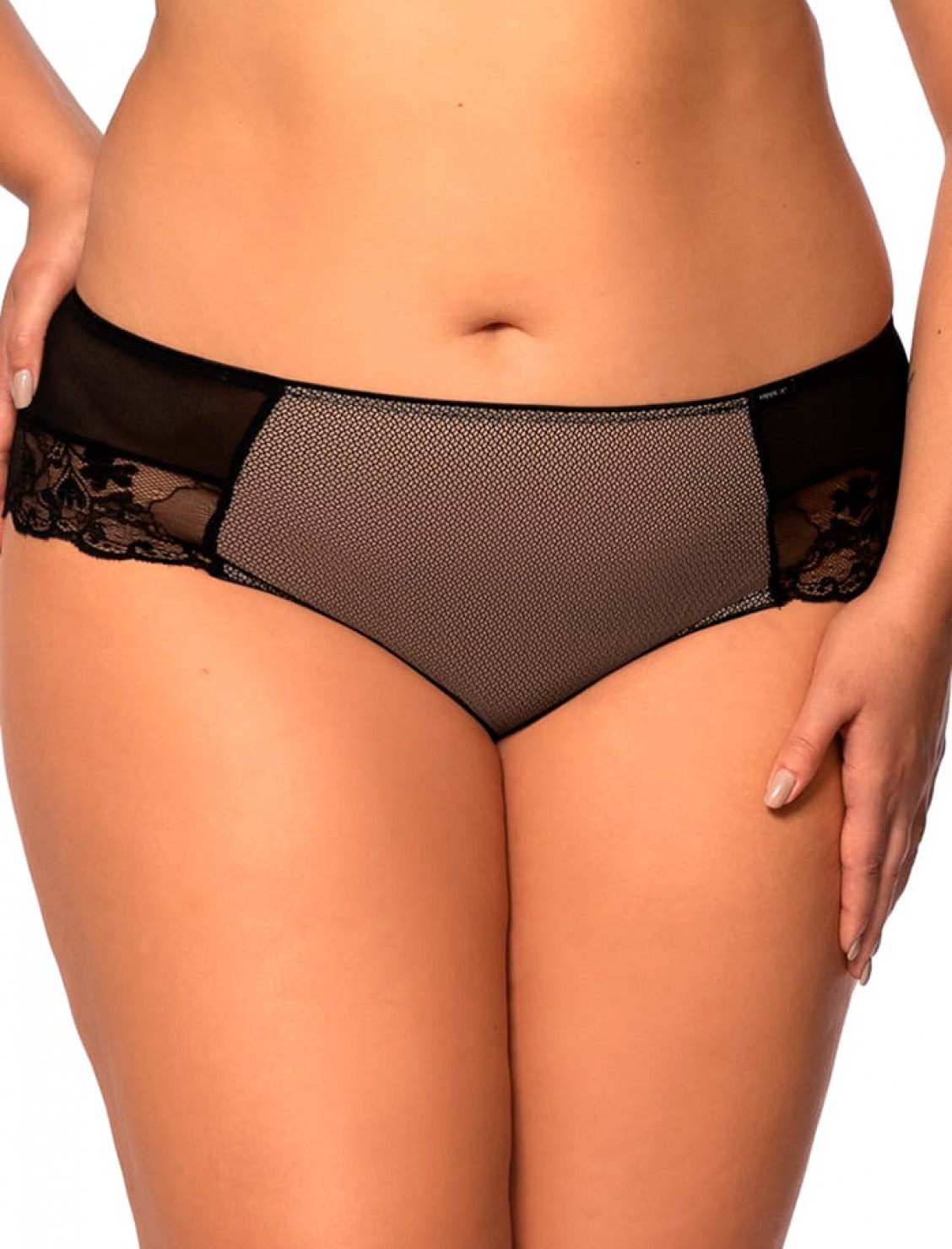 Braga super bonita y sexy de encaje en la parte trasera, con la parte delantera en color piel recubierta de una rejilla colo negro que le dan un toque de elegancia y sofisticación. Esta es una braga ideal tanto para el día a día como para una ocasión especial.