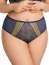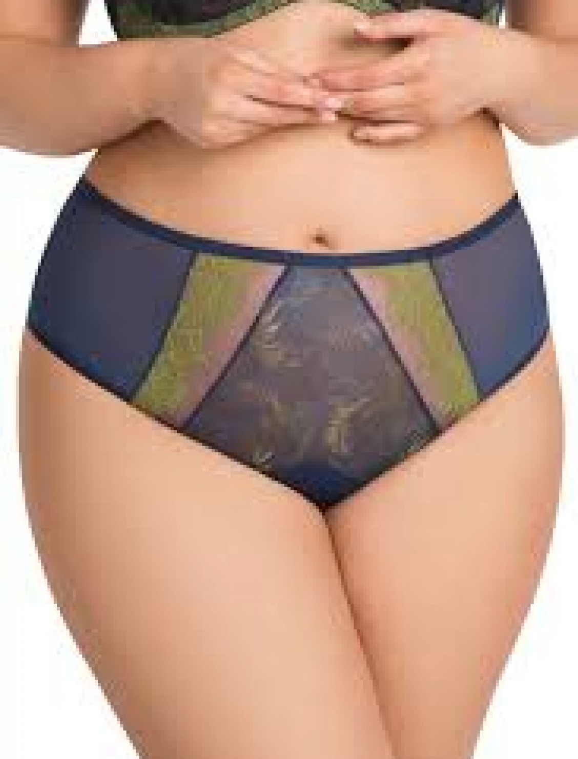 Braga Alta Arianna de Gorsenia, en azul marino con encaje floral en verde claro.