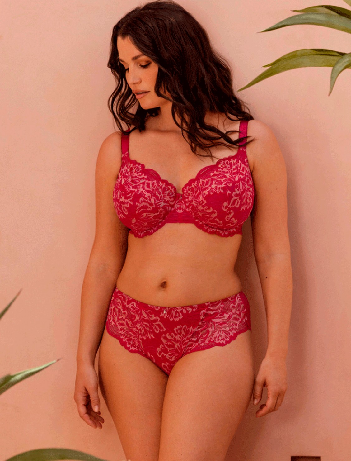 Braga de corte clásico confeccionada en lycra su parte trasera y un precioso encaje floral por delante en un tono rojo combinado con rosa de la marca fantasie.
