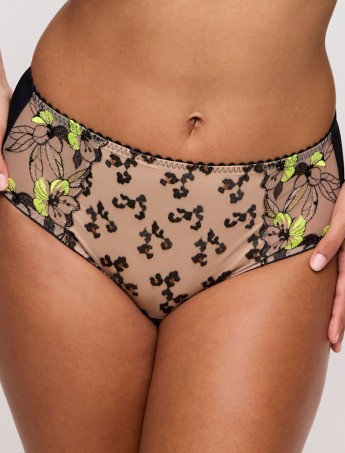 La braga alta PrimaDonna Manali (0563572) no es una braguita cualquiera. Es un espectáculo. Con fondo tostado, bordado en negro, hilos dorados y flores en verde flúor, esta prenda no pasa de puntillas. Pide paso.