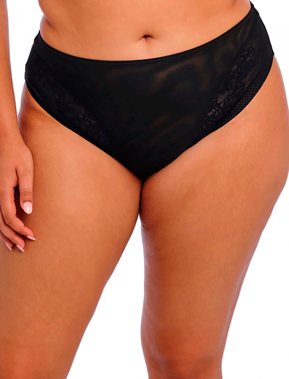 La braga Elomi Nerina EL302753BLK, con encaje parcial y tejido suave adaptable, ofrece comodidad, feminidad y elegancia en color negro.