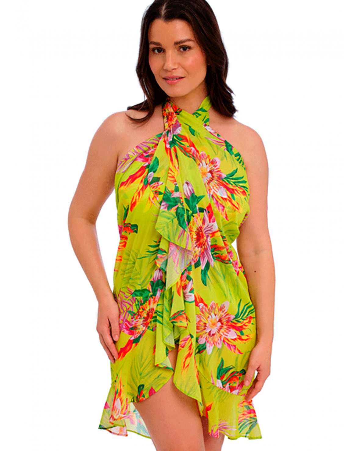 Pareo multiposiciones FS505291ZET con estampado tropical, ligero, versátil y favorecedor. Llévalo como vestido, falda o chal. Ideal para combinar con cualquier bikini o bañador.