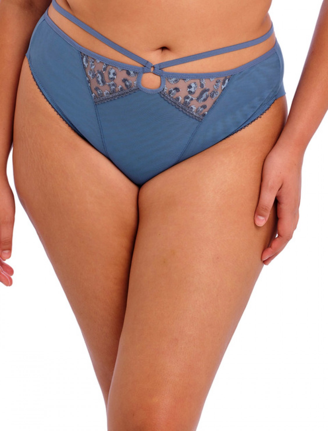 Culotte Namrah de Elomi en azul, bordado de animal print en tul transparente en la parte superior.