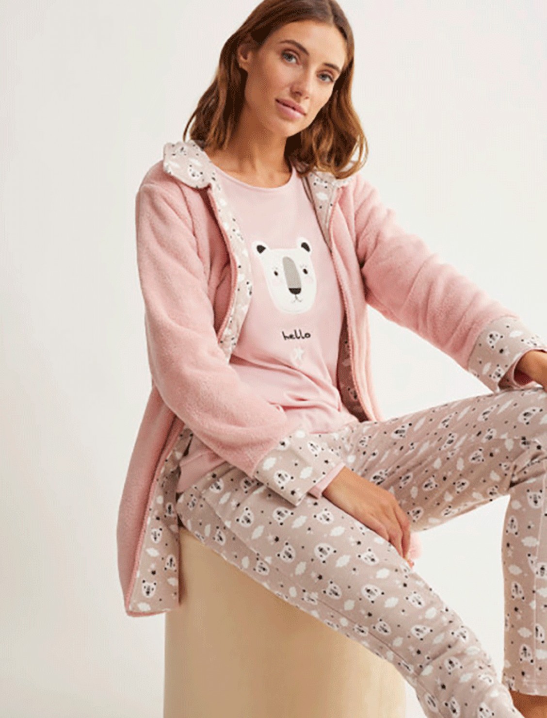 Pijama 3 piezas de promise, bata de coralina con dibujo de oso en tono rosa y piedra