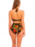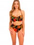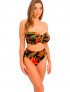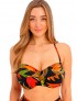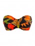 Sujetador de bikini bandeau con aro y semirelleno ,con tirante extraible y diseño cruzado en entrepecho,con estampado tropical sobre fondo negro.
