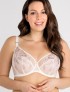 Sujetador Love Game de Gorsenia, con aro y sin relleno, en blanco y bordado floral en la copa en rosa y camel.