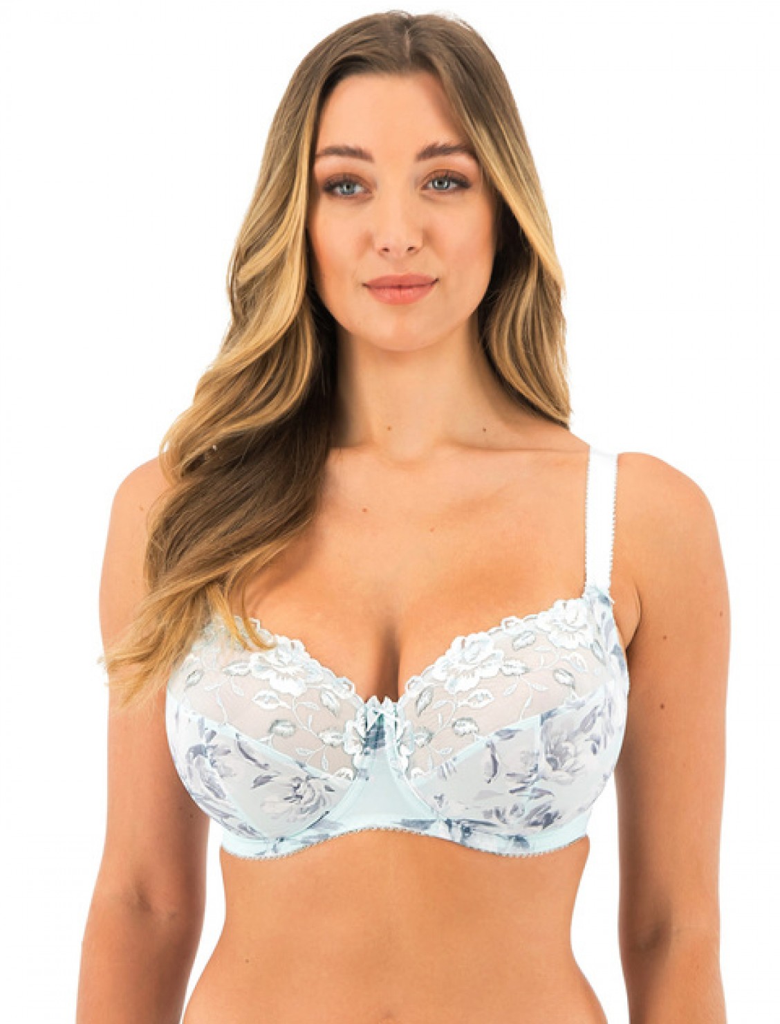 Sujetador Carolina de Fantasie en color menta con estampado floral, bordado floral sobre tul transparente en la parte superior de las copas.