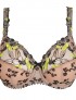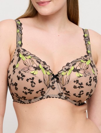 Sujetador PrimaDonna Manali Wild Bloom (0163570). Con fondo tostado y bordado en negro, dorado y verde flúor. Elegante, rompedor y con una sujeción impecable gracias a su copa en tres piezas y refuerzo lateral. Para mujeres que ya no quieren pasar desapercibidas.
