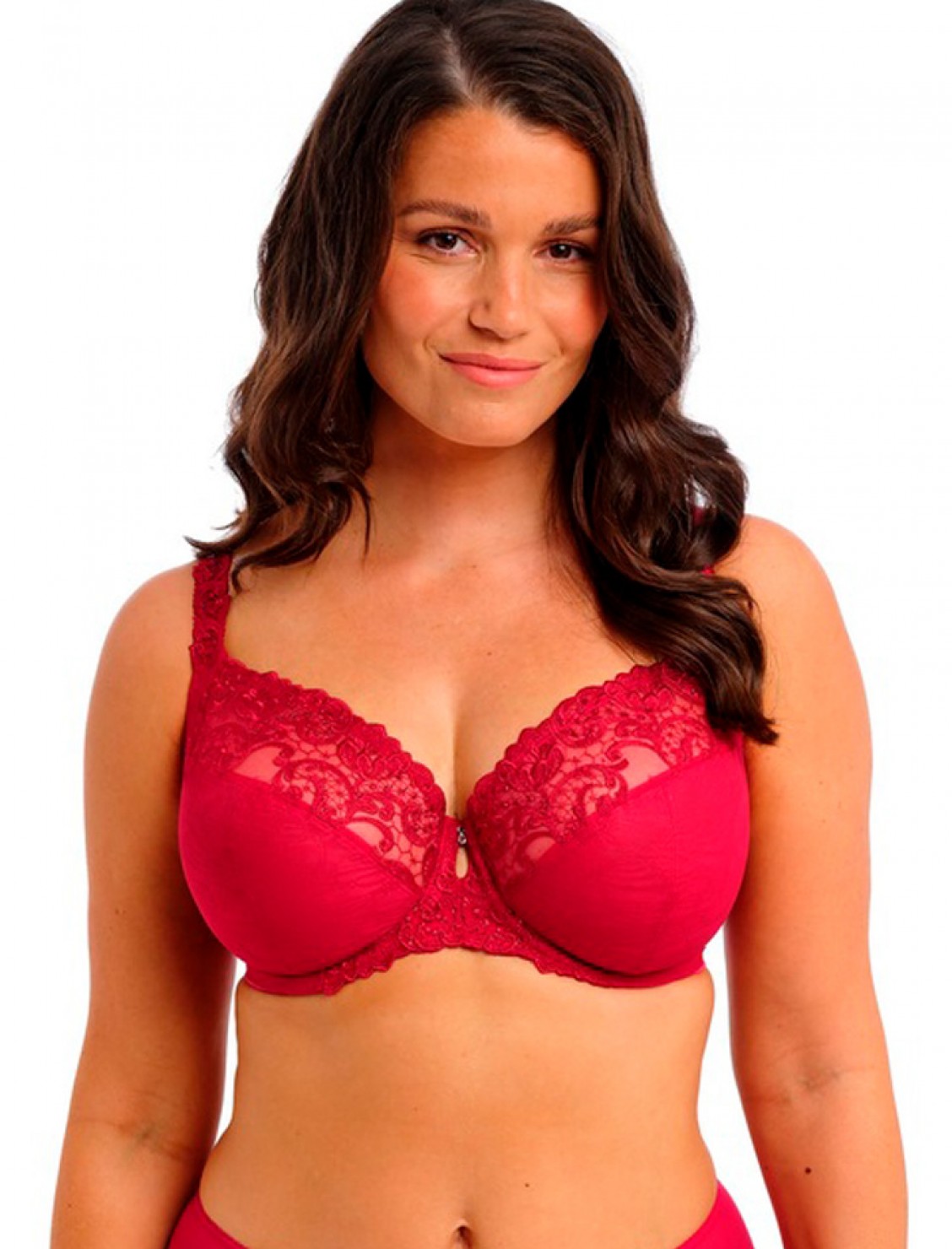 Sujetador Portia de Fantasie, sin relleno con aro. En tul semitransparente rojo, con bordado floral negro y brillante.
