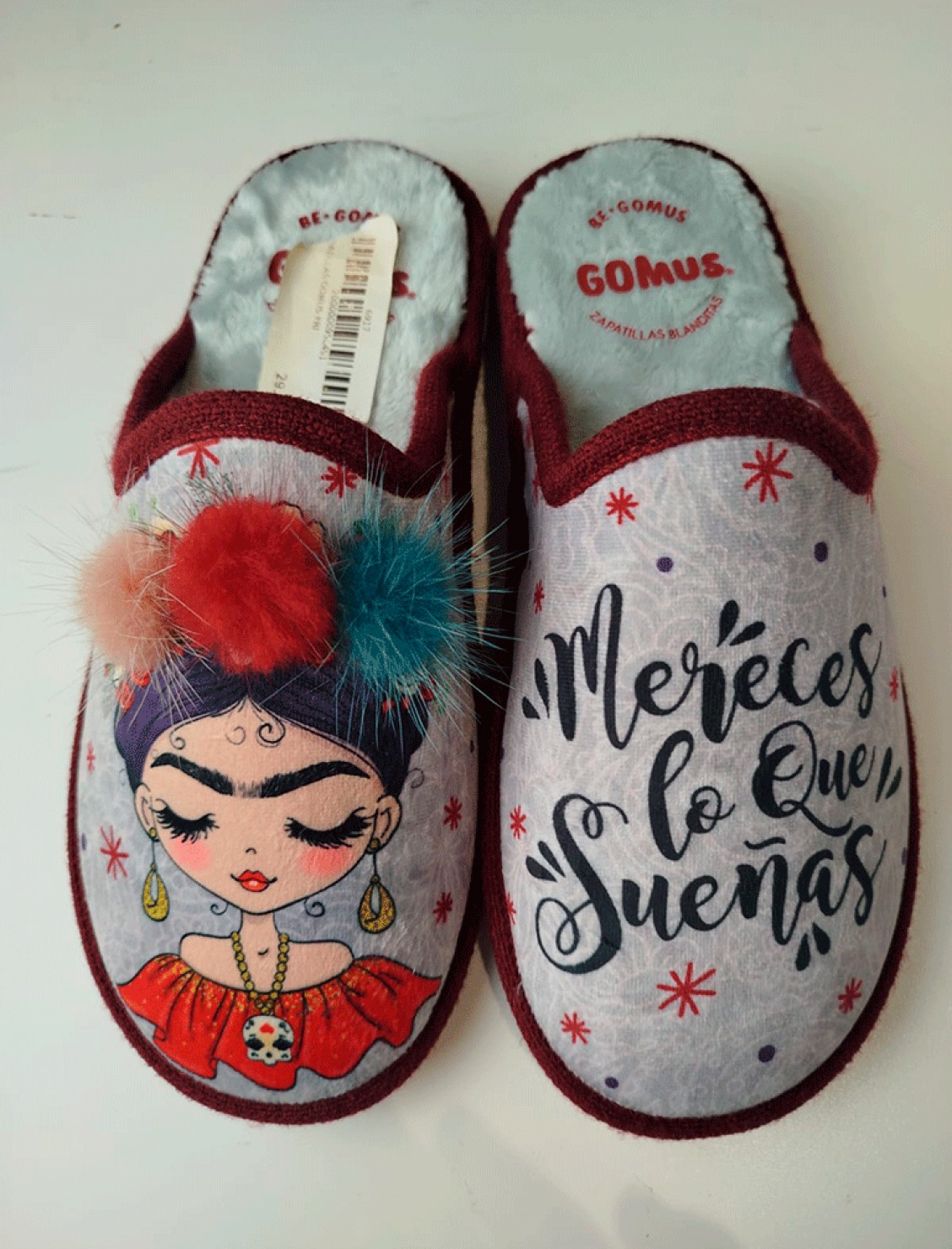 Zapatillas gomus, color granate con frida kalo, y suela antideslizante.