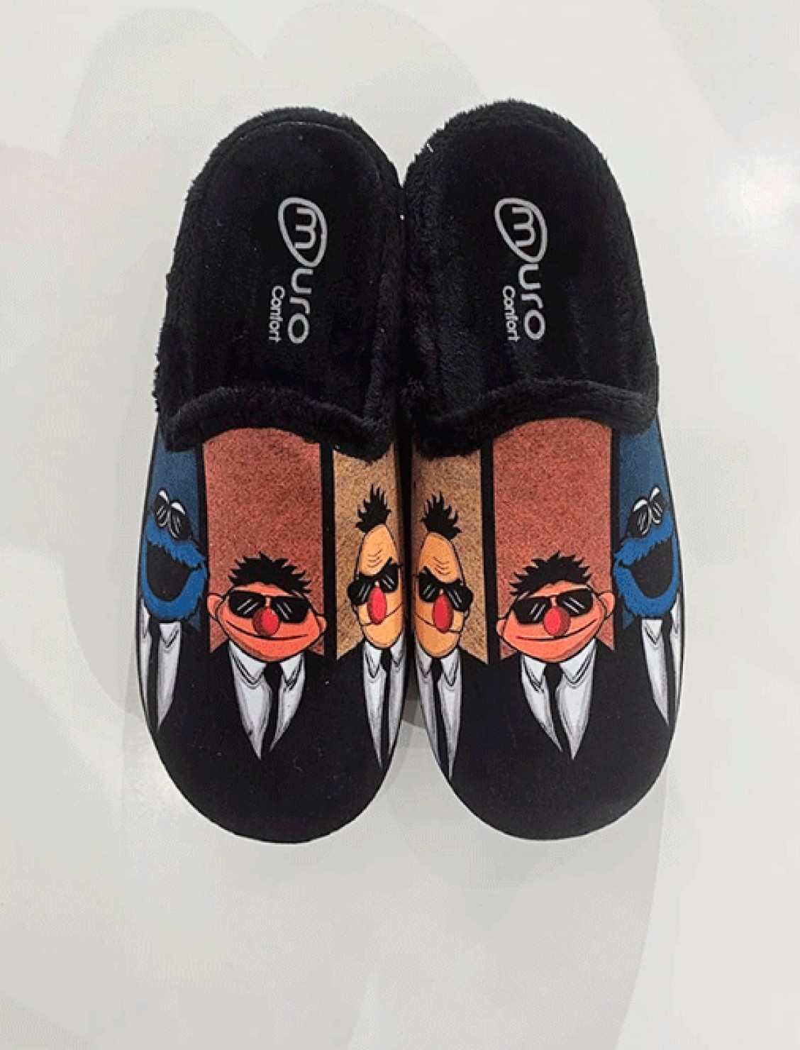 Zapatillas super comodas de la marca muro con diseño de Epi,Blas y el monstruo de las galletas vestidos de negro.