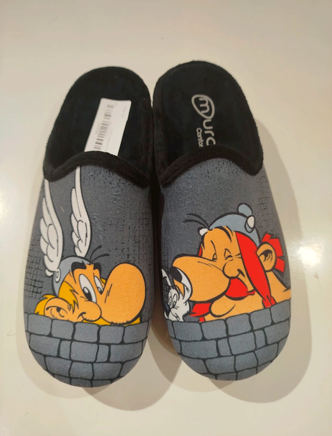 Zapatillas de la marca muro muy comodas de color gris con dibujo de asterix.